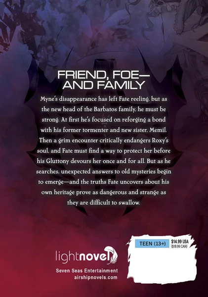 Myne’s disappearance has left Fate reeling, but as the new head of the Barbatos family, he must be strong. At first he’s focused on reforging a bond with his former tormenter and new sister, Memil. Then a grim encounter critically endangers Roxy’s soul, and Fate must find a way to protect her before his Gluttony devours her once and for all. But as he searches, unexpected answers to old mysteries begin to emerge—and the truths Fate uncovers about his own heritage prove as dangerous and strange as they are difficult to swallow.