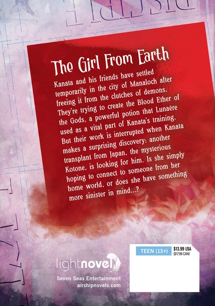 Kanata and his friends have settled temporarily in the city of Manaloch after freeing it from the clutches of demons. They’re trying to create the Blood Ether of the Gods, a powerful potion that Lunaère used as a vital part of Kanata’s training. But their work is interrupted when Kanata makes a surprising discovery: another transplant from Japan, the mysterious Kotone, is looking for him. Is she simply hoping to connect to someone from her home world, or does she have something more sinister in mind…?
