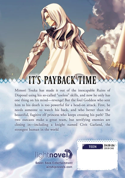 Mimori Touka has made it out of the inescapable Ruins of Disposal using his so-called “useless” skills, and now he only has one thing on his mind–revenge! But the foul Goddess who sent him to his death is too powerful for a head-on attack. First, he needs someone to watch his back, and who better than the beautiful, fugitive elf princess who keeps crossing his path? The two outcasts make a great team, but terrifying enemies are closing in–including a knight named Civit Garland, the strongest human in the world.