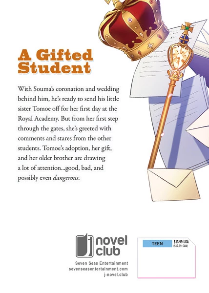 With Souma’s coronation and wedding behind him, he’s ready to send his little sister Tomoe off for her first day at the Royal Academy. But from her first step through the gates, she’s greeted with comments and stares from the other students. Tomoe’s adoption, her gift, and her older brother are drawing a lot of attention…good, bad, and possibly even dangerous.