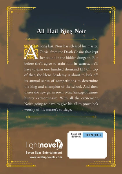At long last, Noir has released his master, Olivia, from the Death Chains that kept her bound in the hidden dungeon. But before she’ll agree to train him in earnest, he’ll have to earn one hundred thousand LP! On top of that, the Hero Academy is about to kick off its annual series of competitions to determine the king and champion of the school. And then there’s the new girl in town, Mira Santage, treasure hunter extraordinaire. With all the excitement, Noir’s going to have to give his all to prove he’s worthy of his master’s tutelage.