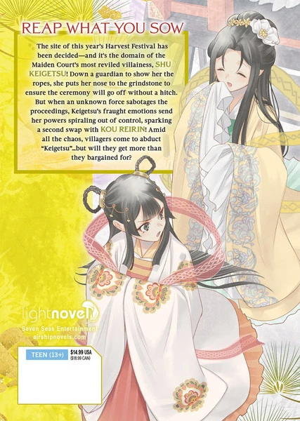 The site of this year’s Harvest Festival has been decided—and it’s the domain of the Maiden Court’s most reviled villainess, Shu Keigetsu! Down a guardian to show her the ropes, she puts her nose to the grindstone to ensure the ceremony will go off without a hitch. But when an unknown force sabotages the proceedings, Keigetsu’s fraught emotions send her powers spiraling out of control, sparking a second swap with Reirin! Amid all the chaos, villagers come to abduct “Keigetsu”…but will they get more than they bargained for?