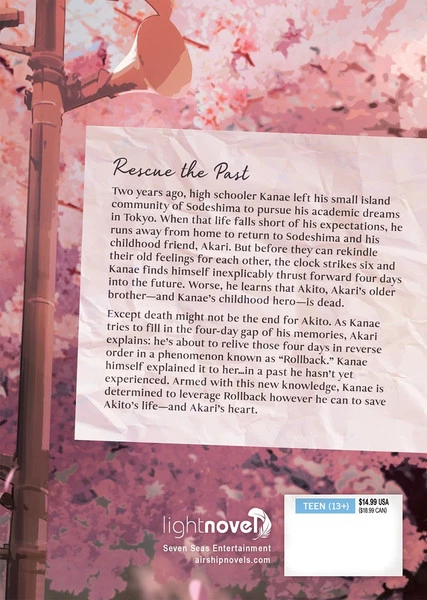 Except death might not be the end for Akito. As Kanae tries to fill in the four-day gap of his memories, Akari explains: he’s about to relive those four days in reverse order in a phenomenon known as “Rollback.” Kanae himself explained it to her…in a past he hasn’t yet experienced. Armed with this new knowledge, Kanae is determined to leverage Rollback however he can to save Akito’s life–and Akari’s heart.