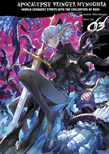 Apocalypse Bringer Mynoghra: World Conquest Starts with the Civilization of Ruin novel volume 3 was written by Fehu Kazuno with illustrations by Jun.