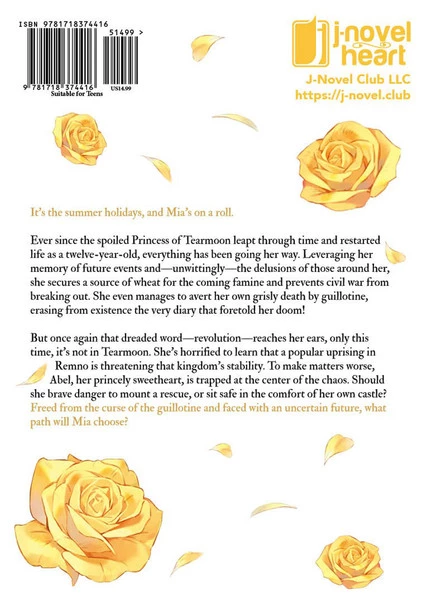 Ever since the spoiled princess of Tearmoon leapt through time and restarted life as a twelve-year-old, everything has been going her way. Leveraging her memory of future events and—unwittingly—the delusions of those around her, she secures a source of wheat for the coming famine and prevents civil war from breaking out. She even manages to avert her own grisly death by guillotine, erasing from existence the very diary that foretold her doom!