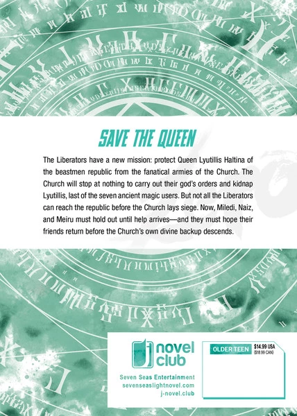 The Liberators have a new mission: protect Queen Lyutillis Haltina of the beastmen republic from the fanatical armies of the Church. The Church will stop at nothing to carry out their god’s orders and kidnap Lyutillis, last of the seven ancient magic users. But not all the Liberators can reach the republic before the Church lays siege. Now, Miledi, Naiz, and Meiru must hold out until help arrives—and they must hope their friends return before the Church’s own divine backup descends.