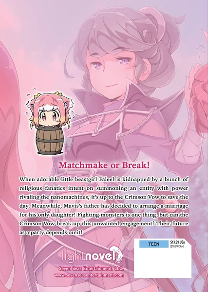 When adorable little beastgirl Faleel is kidnapped by a bunch of religious fanatics intent on summoning an entity with power rivaling the nanomachines, itโs up to the Crimson Vow to save the day. Meanwhile, Mavisโs father has decided to arrange a marriage for his only daughter! Fighting monsters is one thing, but can the Crimson Vow break up this unwanted engagement? Their future as a party depends on it!