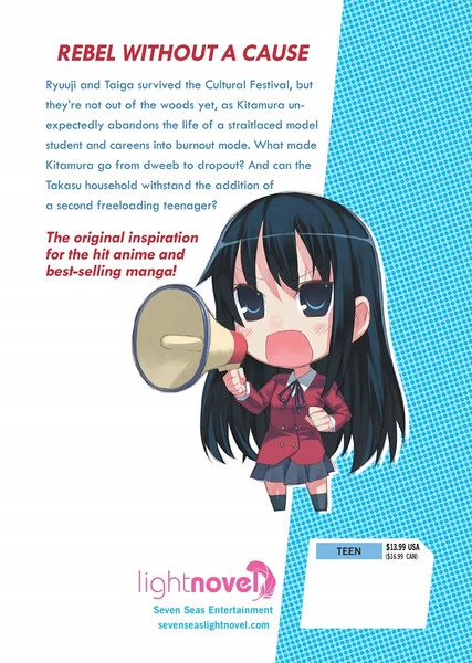 Ryuuji and Taiga survived the Cultural Festival, but theyβre not out of the woods, yet, as Kitamura unexpectedly abandons the life of a straitlaced model student and careens into burnout mode. What made Kitamura go from dweeb to dropout? And can the Takasu household withstand the addition of a second freeloading teenager?